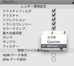 ちょっと時間はたってしまいましたが、Cheetah3D 4.6.2 が出てます。バグフィックスメインのアップデートとの事ですが、レンダリングの最終フィルター処理が選べるようになりました。レンダリングがよりシャープに仕上げる事が可能との事なんですが、違いはいまいち分からず。 ![]()